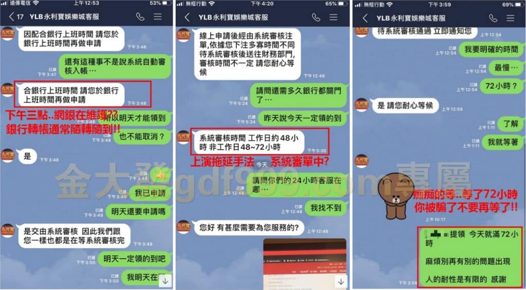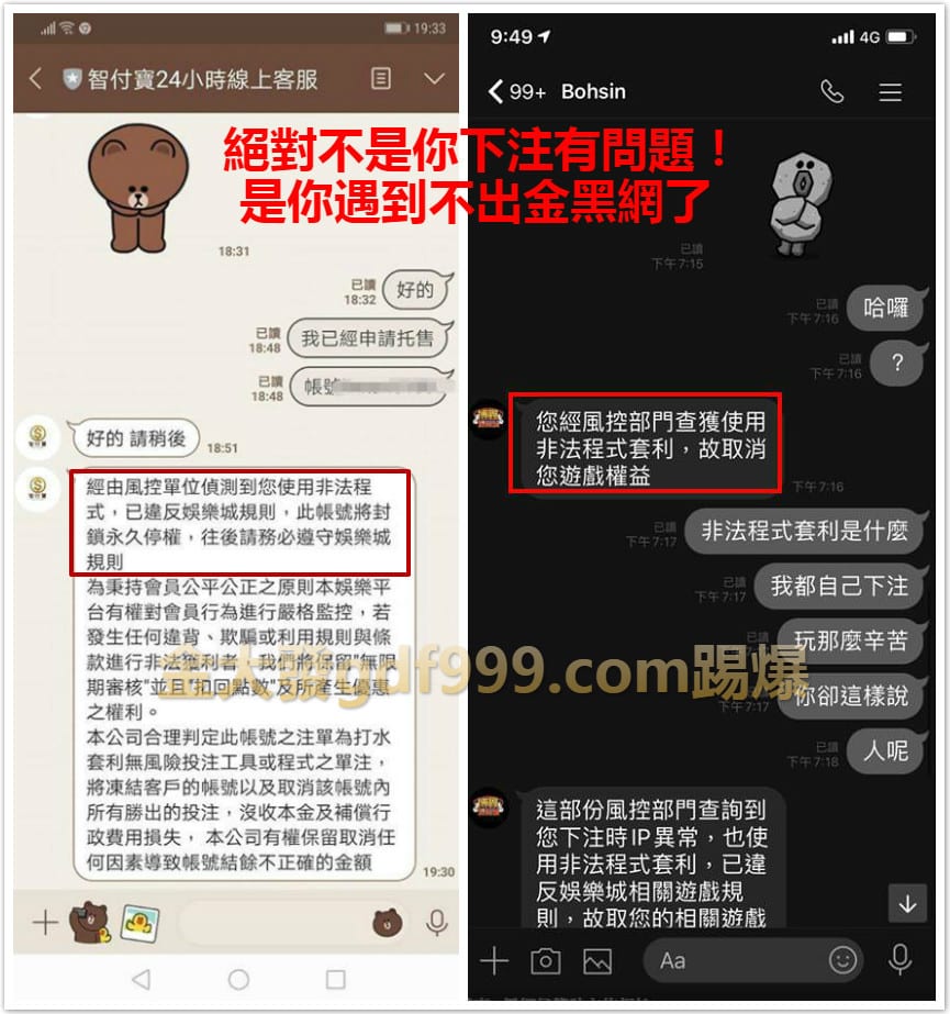 非法套利到底是什麼?明明是正常下注,輸錢的時候沒說你套利,贏錢要提款時理由百百款!這也是其中一個常見不出金話術,當然他不出金給你的理由千錯萬錯都會在你身上,沒錯也會變有錯,這個不出金理由比較直白,通常不會叫你等!直接就是跟你say掰掰的意思~此刻的你也該清醒不要鑽牛角尖覺得是自己哪裡下注有問題…一樣是個不出金話術!