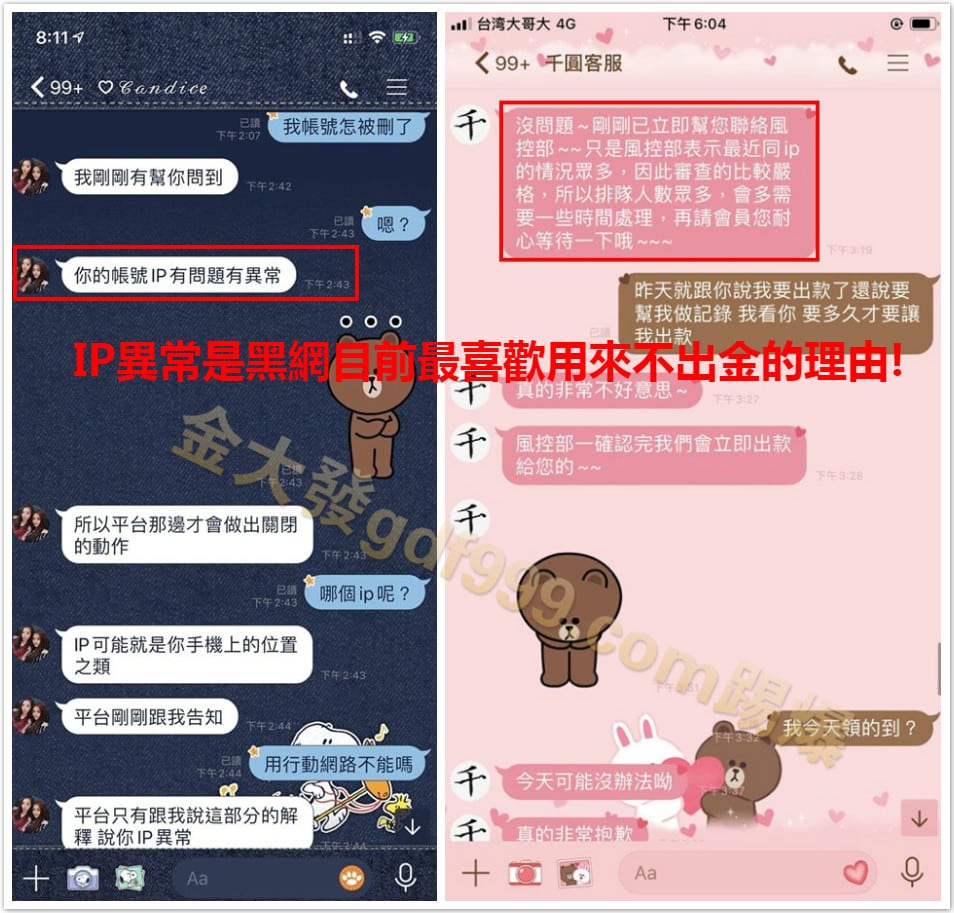 某天想登入遊戲或者申請提款的時候,是否驚嚇發現,帳號無法登入?!這時聯繫客服,會聽到黑網客服回你:風控部門表示您下注時IP異常,真是讓人有滿滿的黑人問號…IP異常是黑網送客一大手法,責任在你不在娛樂城!是你IP先異常的!大多都會發生在獲利想提款的會員身上!只要你輸錢包準你IP沒異常…鼻子摸摸認清事實吧!並不是你連接除了手機以外的熱點或者WIFI,這時你去跟客服吵鬧也只是換來以讀不回,因為他就是詐騙黑網阿沒有出金的打算