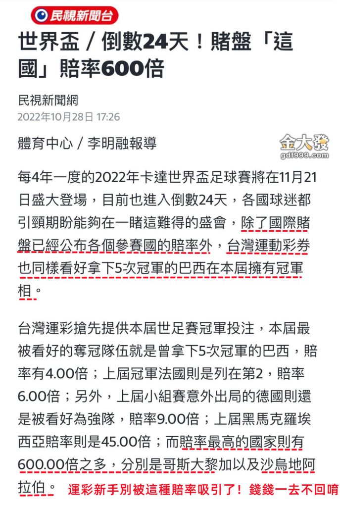 你以為足球玩法中波膽賠率最高嗎?錯!還有個東西叫做誘盤…連台灣運彩都開出誘盤讓玩家下注,本屆世足冠軍賠率最高的是沙烏地阿拉伯以及哥斯大黎加… 賠率高達600倍,只能說實力決定賠率!這種爆高賠率打死都不可能奪冠,基本上會在32強小組賽就被淘汰…最多闖進16強,金大發奉勸新手彩迷別亂花錢購買這種盤口唷。