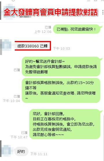 看完以上總總出金紀錄,有哪間娛樂城可以提供你這些對話資訊呢?金大發會員臥虎藏龍,不管玩哪種賽事,都能輕鬆獲利,相信你也是下個高額出金的會員,不要再遊戲不出金的黑網了,就算領取高額贈點又如何?讓你贏的到領不到!快速註冊享有免費運彩殺手報牌