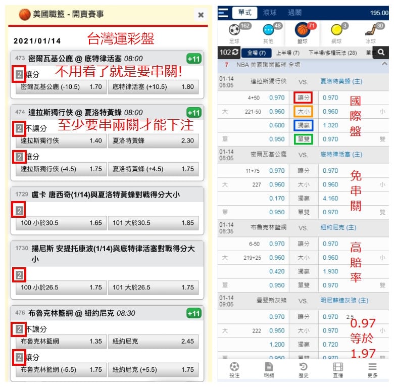 有玩過威剛運彩會員都知道,要下注到免串關的單場賽事比登天還難…至少得串兩關才能買運動彩券…受夠了不平等待遇嗎?地下球版單場賽事開好開滿,想下注NBA不讓分(國際盤獨贏)也有喔!國際盤玩法多,地下球版賠率又高,且不用擔心國際盤有無合法問題,絕對讓新手會員玩的安全又放心