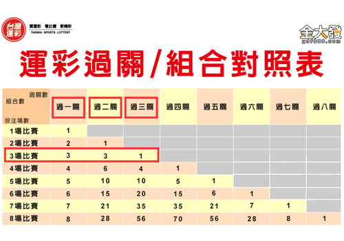 過關組合即為複式串關,可以避免一關沒過,無法領彩金的風險。以複式串三關為例子,3串1一組、2串1三組、1串1三組。透過過關組合的方式投注,即使串三關只過一關都有錢拿!