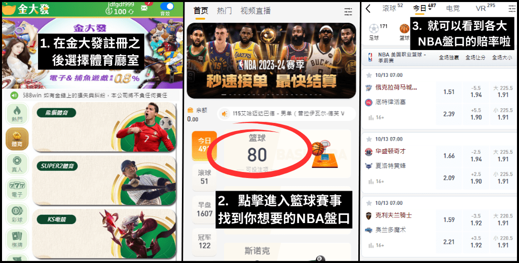 - 步驟四:找到「籃球NBA」賽事,選擇你想要投注的盤口