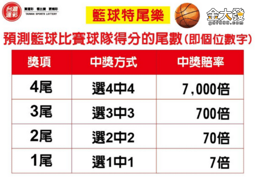 - 特尾樂:莊家挑出兩場賽事(共4支隊伍)進行「猜隊伍得分的尾數」的投注。玩家最少需下注1尾、最多4尾的冷門玩法。由於玩法無技巧可言純靠猜,所以中獎賠率也相當可觀。