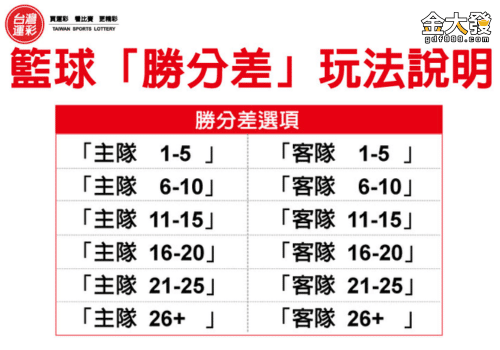 - 勝分差:預測你下注的隊伍會贏多少分。這個玩法除了要預測勝分差,還要預測該賽事的獲勝隊伍,對運彩新手難度較高。以台灣運彩玩法說明,勝分差選項一共可投注12組。