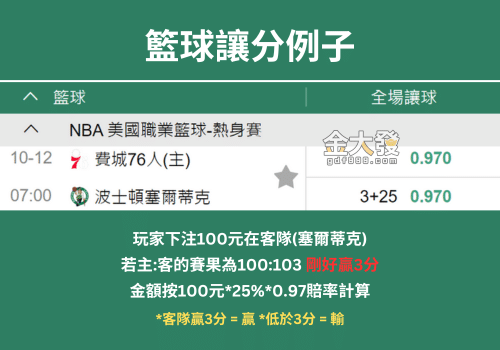 例子:莊家開出A隊讓B隊5分的盤口。你下注在A隊而最終A:B的比分為106:100(勝分超過5以上)則贏。 - 單節讓分:一場籃球賽事有4節,每節10分鐘。單節讓分即預測該節的讓分隊是否會獲勝。