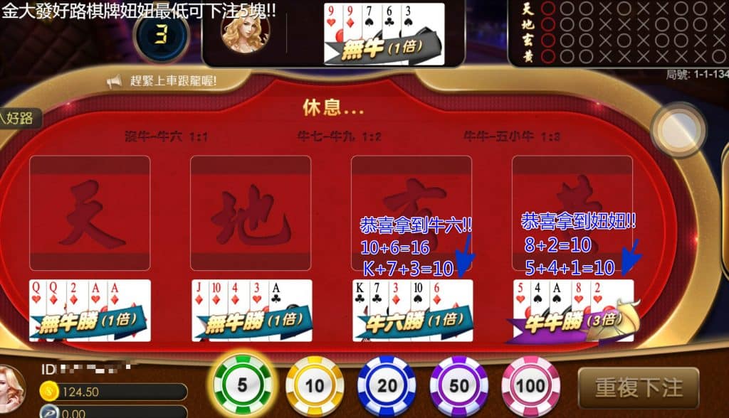 下圖是金大發好路棋牌百人牛牛,可清楚看到最低可以下注5塊,小賭怡情,小資賭客手癢首選阿!哪怕儲值500來來回回也可以玩上許久,另外右上方就是妞妞牌路參考,要下注之前請先比較一下天地玄黃哪家獲勝率比較高,跟注就對了