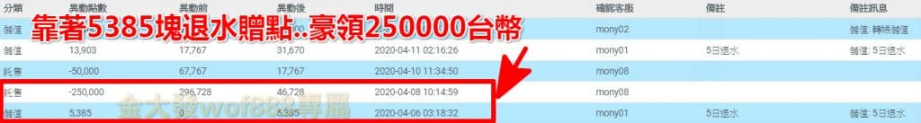 下圖可清楚看到此會員還是利用平台贈送的返水贈點下去玩線上妞妞,還真讓他翻倍贏了25萬出去…並且成功提領!金大發出金保障,絕對讓你看的到也領的到,心動不如馬上行動,給自己一個賺錢機會,那怕你的本金只有小小的500或1000也能夠讓你翻倍再翻倍