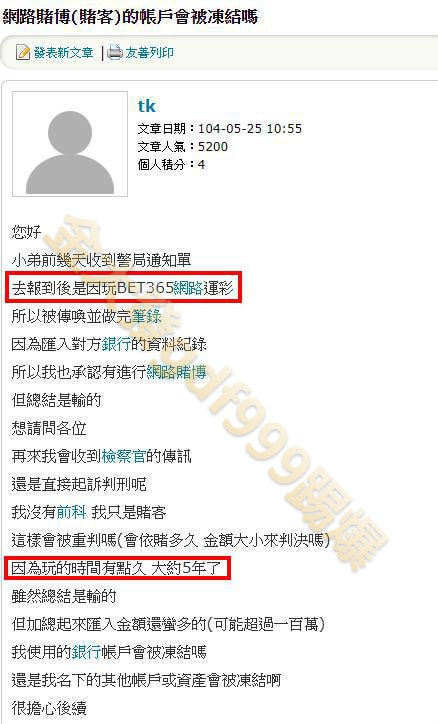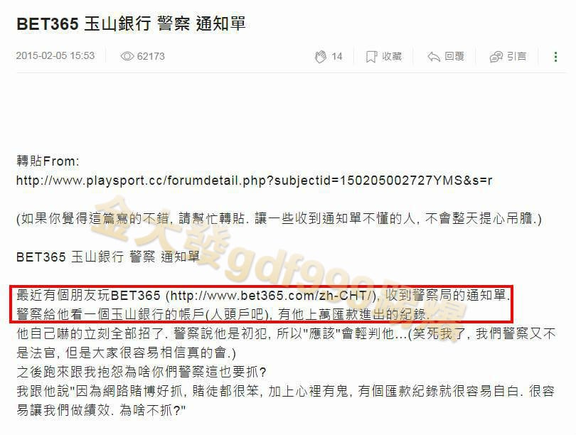 收傳票也只能認栽了,當然收傳票也不會只有你一人,肯定是肉粽概念一串都被捕獲,bet365提供給你的匯款帳號,肯定會有不少人跟你一樣使用到同一組,有跟那組帳號有資金往來的通通都會被通知到案,當然最後處理的結果就是多了一個賭博罪前科,並且罰款…實在沒有必要為了玩國外球版挺而走險!