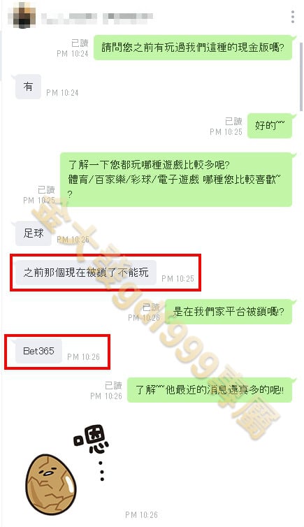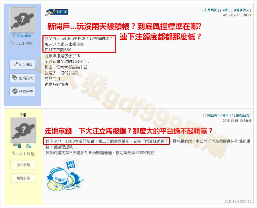 不少玩bet365的會員都有遇到風控問題!多數會員都是贏太多,或者喜歡玩走地(滾球)的會員就很容易被風控不出金,當然這時你跟bet365客服反應,回答都是非常官腔的,會氣死人的那種,有回話跟沒回話是一樣的,沒有任何幫助~更激進的手法,bet365會直接鎖你IP的位置,即使你重新申辦帳號照樣直接被登出…