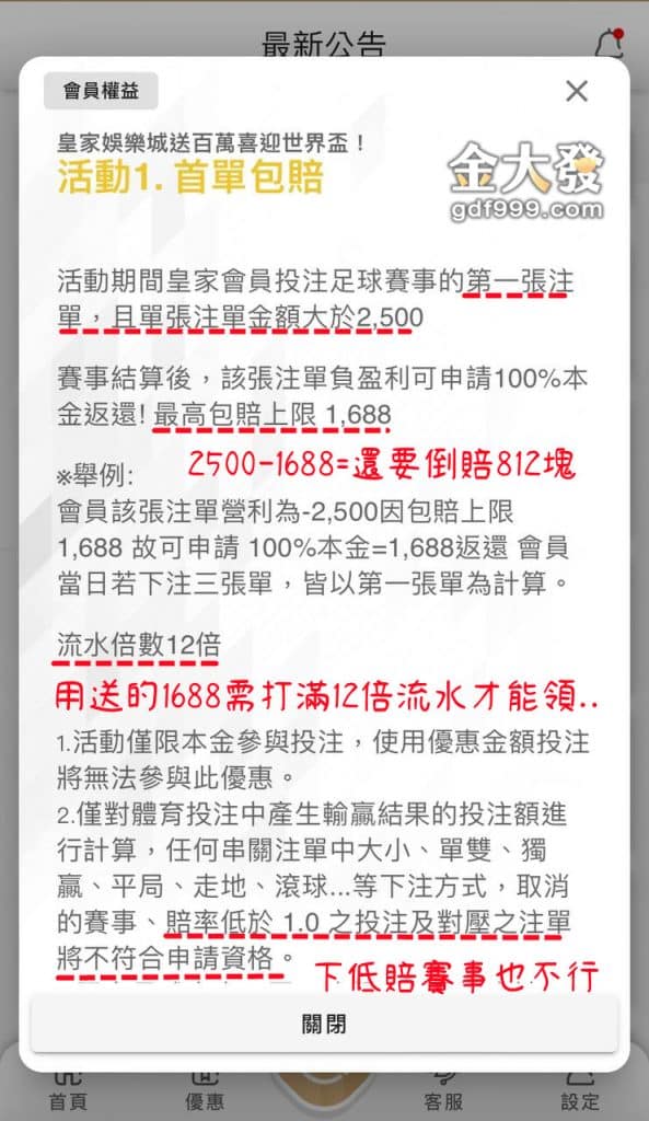 ▲雖說皇家娛樂城優惠多,但爭議也多,不僅剛的體驗金有問題,就連運彩首單包賠活動也說不上的怪!數學不好的玩家建議別申請不然到時後灰不停,體育第一筆投注需大於$2500塊,但保本最高只賠$1688塊,玩家還要倒賠812元,不禁讚嘆這活動有點87!