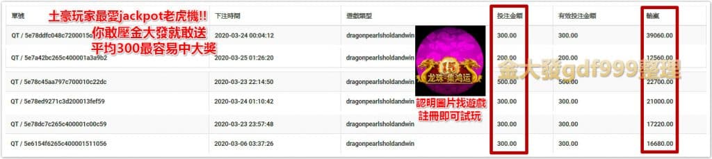 還在百元換千元?金大發就是送很大,業界唯一敢公開會員贏大錢的jackpot玩法不怕你贏就怕你不來試,圓仔了解到很多熱愛玩老虎機大咖會員都受不了豪神,星城,明明都是金卡,鑽卡vip但是平台依舊不賞臉,屢屢拉不到大獎,可疑的是拉大獎的會員總是那幾個!難道這不是內定?金大發龍珠-集鴻運機台顛覆以往,只要你投注金額高,開出大獎彩金保證也高,下圖300開獎頻率最多