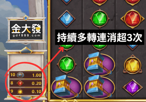 - 訊號三:多次平轉持續連消3次或以上即為機台爆分期,金大發建議虎迷拉大籌碼爭取贏的更多獎金。