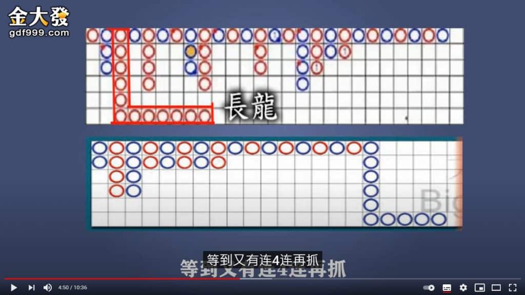 華人教學方式比較像是把網路百家樂技巧文章轉換成影片講給你聽~畢竟現代人不愛看字,喜歡透過看影片方式增加知識,並且教你百家樂正確打法,下圖就是網路裝很常出現的如何分辨百家樂長龍出現時間點!